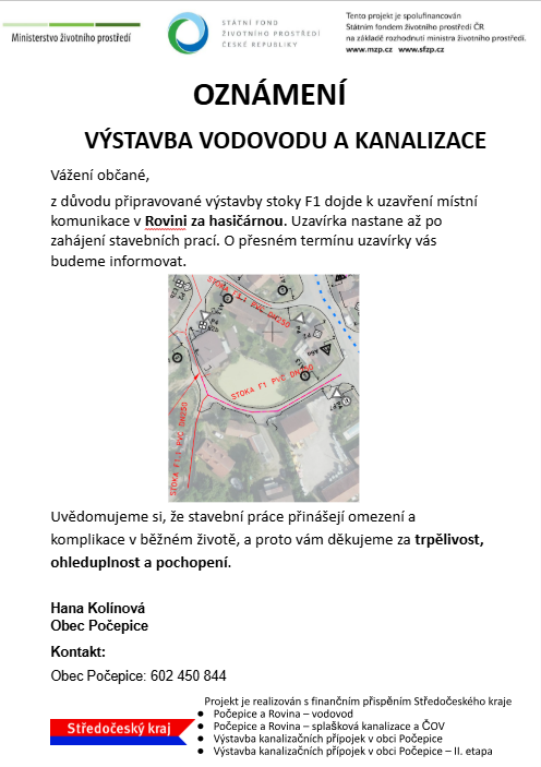 z důvodu připravované výstavby stoky F1 dojde k uzavření místní komunikace v Rovini za hasičárnou. Uzavírka nastane až po zahájení stavebních prací. O přesném termínu uzavírky vás budeme informovat.